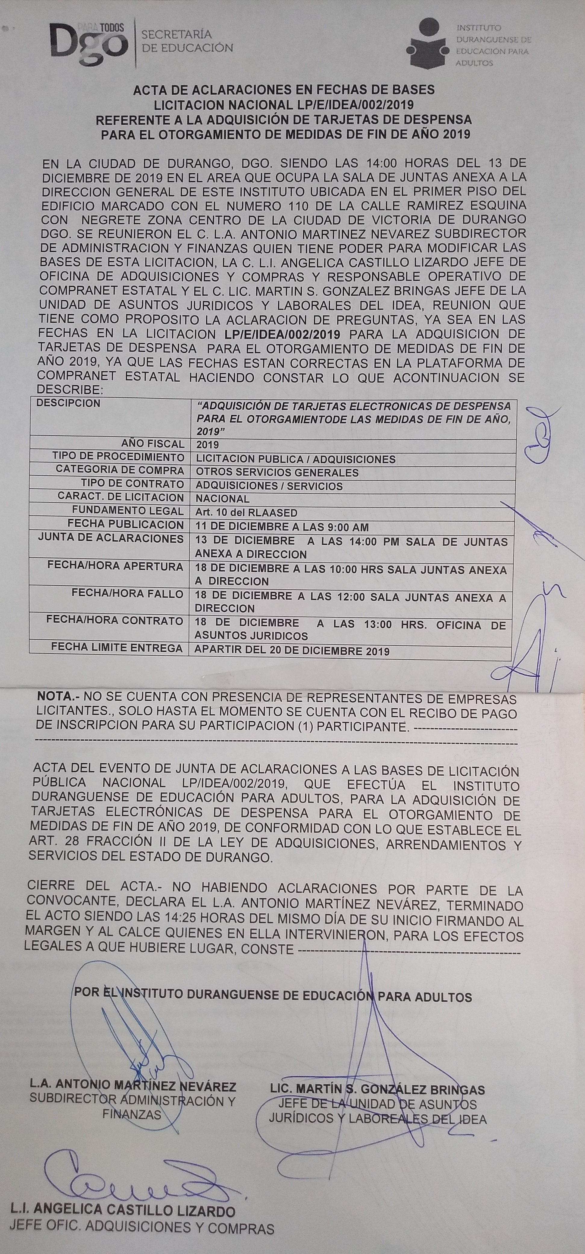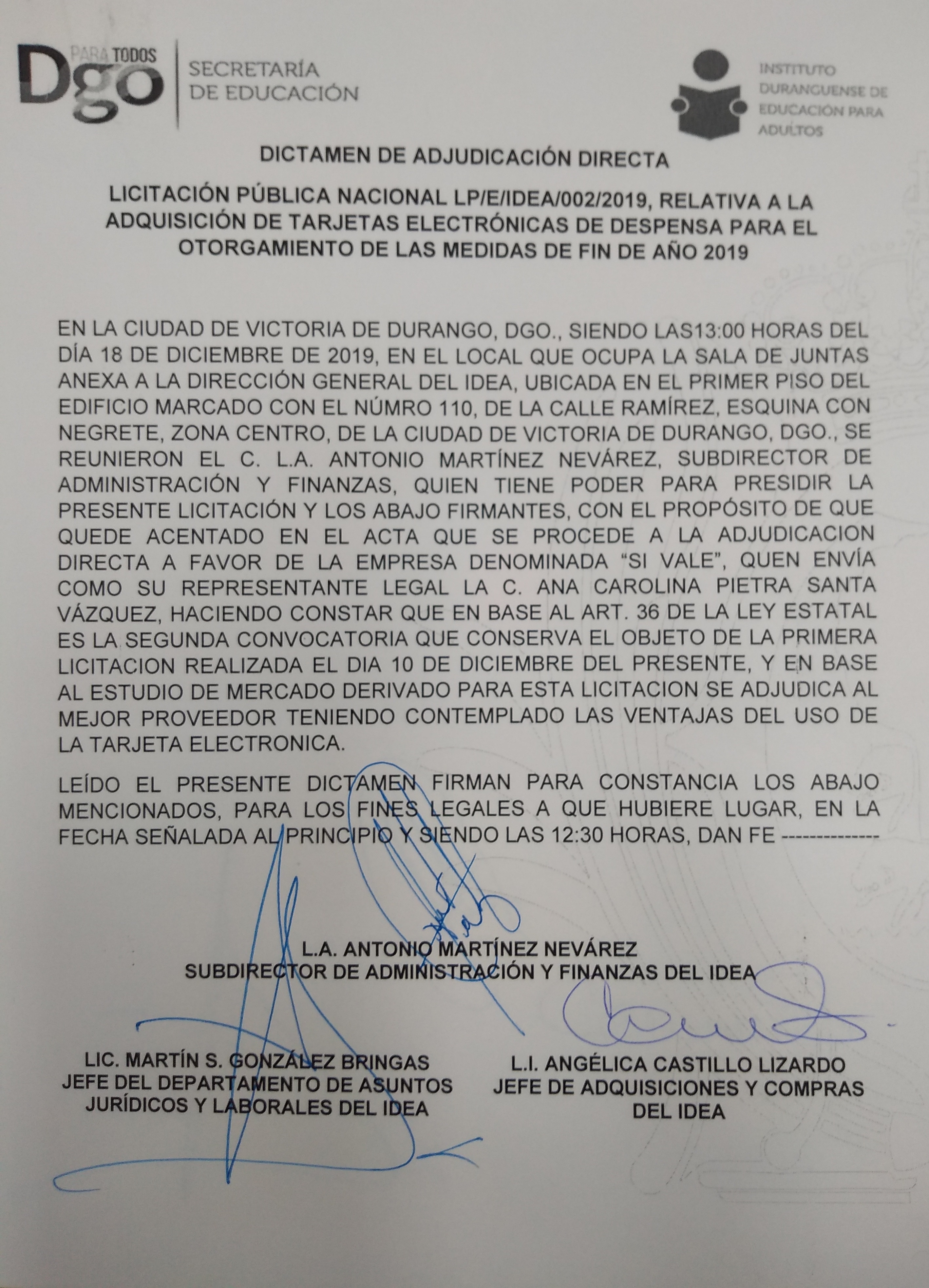 "ADQUISICIÓN DE TARJETAS ELECTRÓNICAS DE DESPENSA PARA EL OTORGAMIENTO DE LAS MEDIDAS DE FIN DE AÑO, 2019"