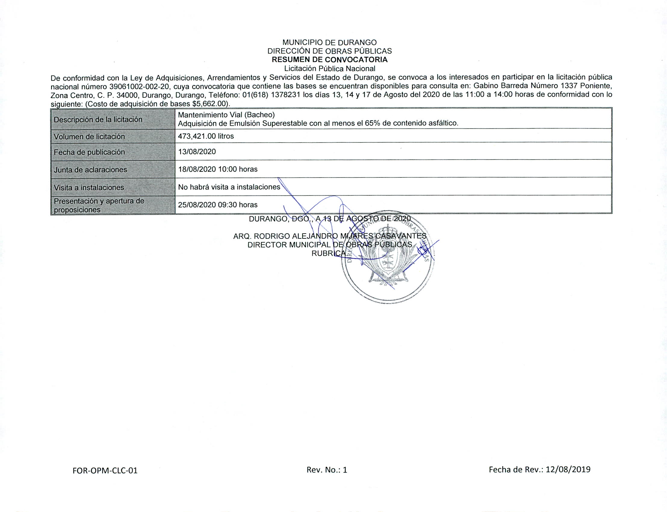 SALA DE JUNTAS DE LA DIRECCIÓN MUNICIPAL DE OBRAS PÚBLICAS, UBICADA EN CALLE GABINO BARREDA NÚMERO 1337 PONIENTE, ZONA CENTRO, C. P. 34000 EN LA CIUDAD DE DURANGO, DGO.