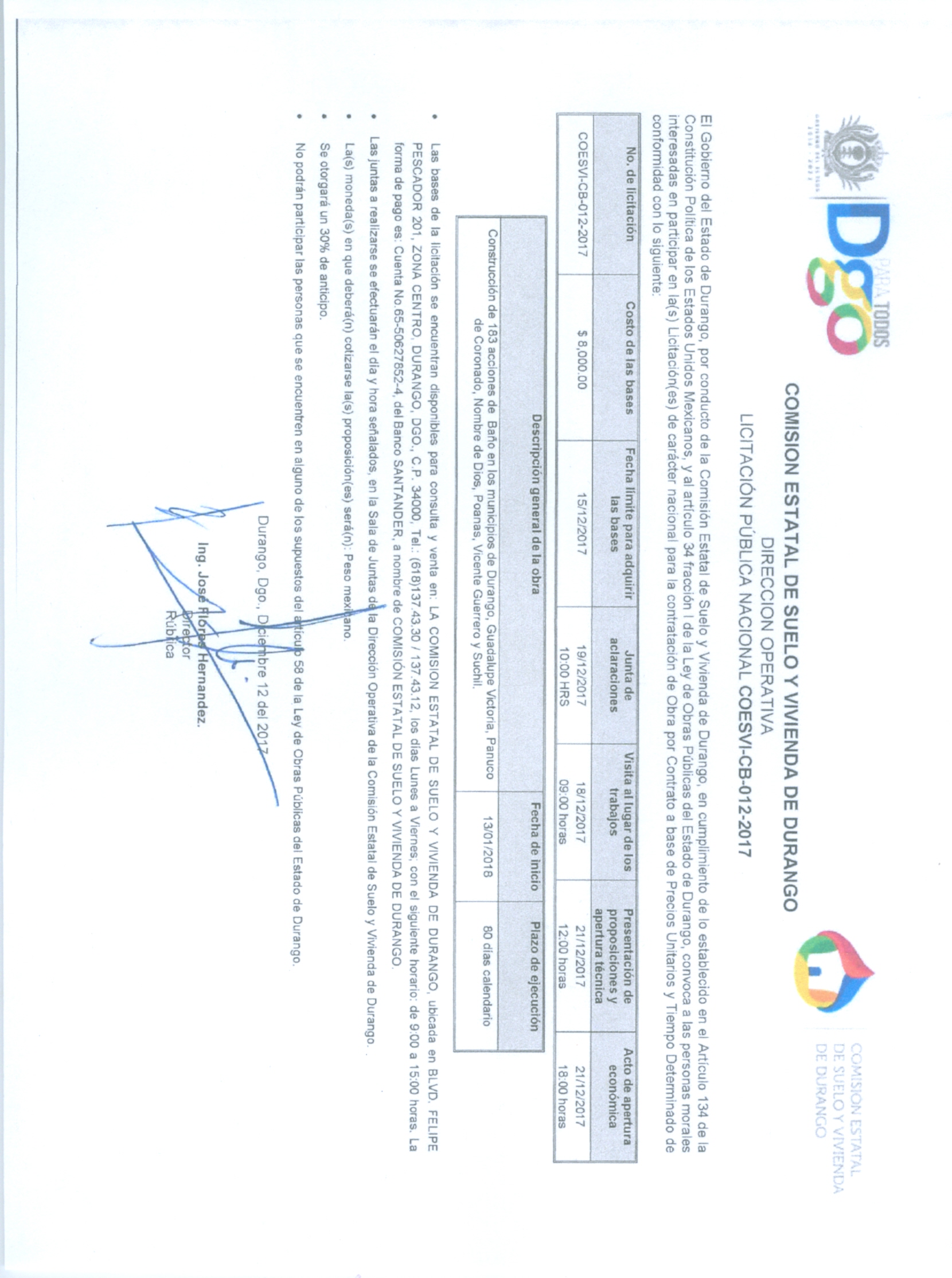 DIRECCION OPERATIVA DE LA COESVI, BLVD. FELIPE PESCADOR 201 PTE, Z. CENTRO, DURANGO, DGO.