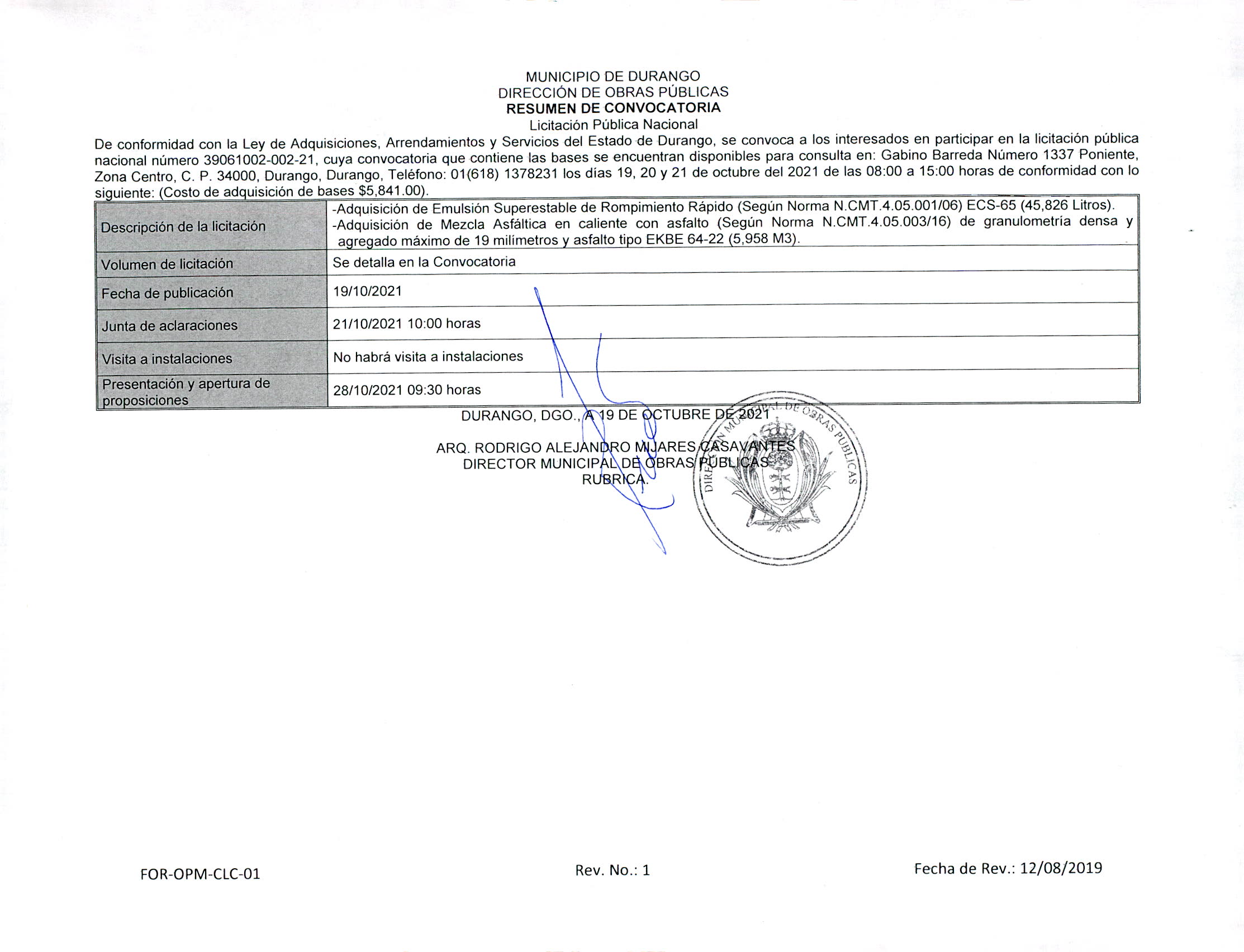 PROGRAMA MANTENIMIENTO VIAL 2021 ADQUISICIÓN DE EMULSIÓN SUPERESTABLE DE ROMPIMIENTO RÁPIDO (SEGÚN NORMA N.CMT.4.05.001/06) ECS-65 (45,826 LITROS). ADQUISICIÓN DE MEZCLA ASFÁLTICA EN CALIENTE CON ASFALTO (SEGÚN NORMA N.CMT.4.05.003/16) DE GRANULOMETRÍA DENSA Y AGREGADO MÁXIMO DE 19 MILÍMETROS Y ASFALTO TIPO EKBE 64-22 (5,958 M3).