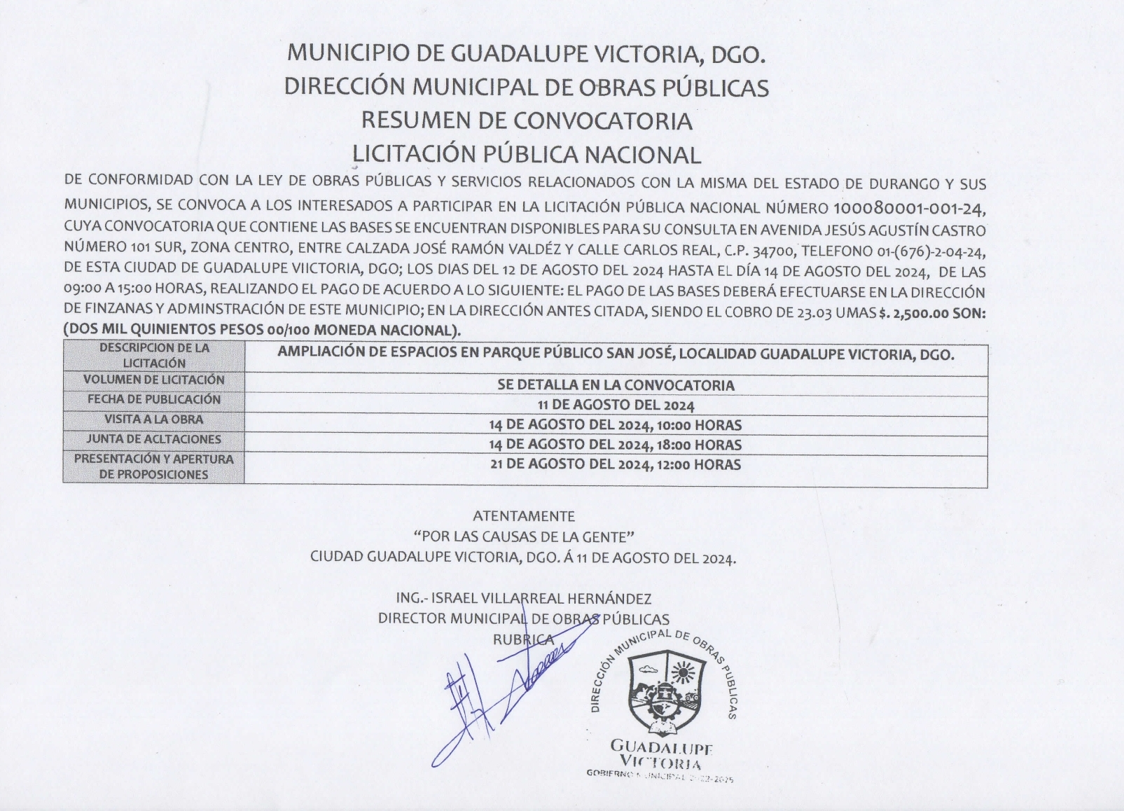 DIRECCIÓN DE OBRAS PÚBLICAS, CON DOMICILIO EN AV. JESÚS AGUSTÍN CASTRO NÚMERO 101 SUR, ZONA CENTRO C.P. 34700, EN LA CIUDAD DE GUADALUPE VICTORIA, DGO.