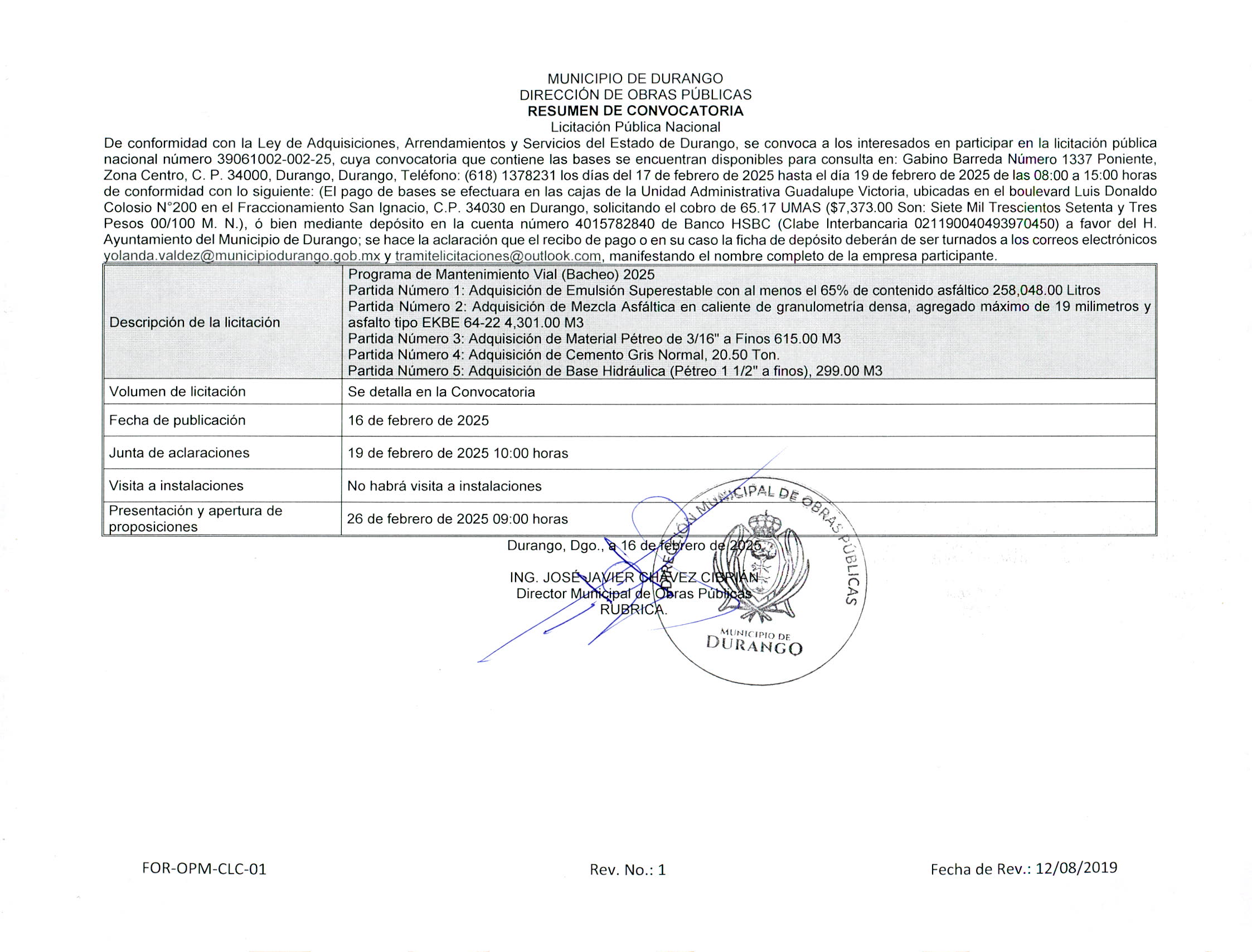 DPO DE LICITACIONES Y CONTRATOS DE LA DIRECCIÓN MUNICIPAL DE OBRAS PÚBLICAS, UBICADA EN CALLE GABINO BARREDA NÚMERO 1337 PONIENTE, ZONA CENTRO, C. P. 34000 EN LA CIUDAD DE DURANGO, DGO.