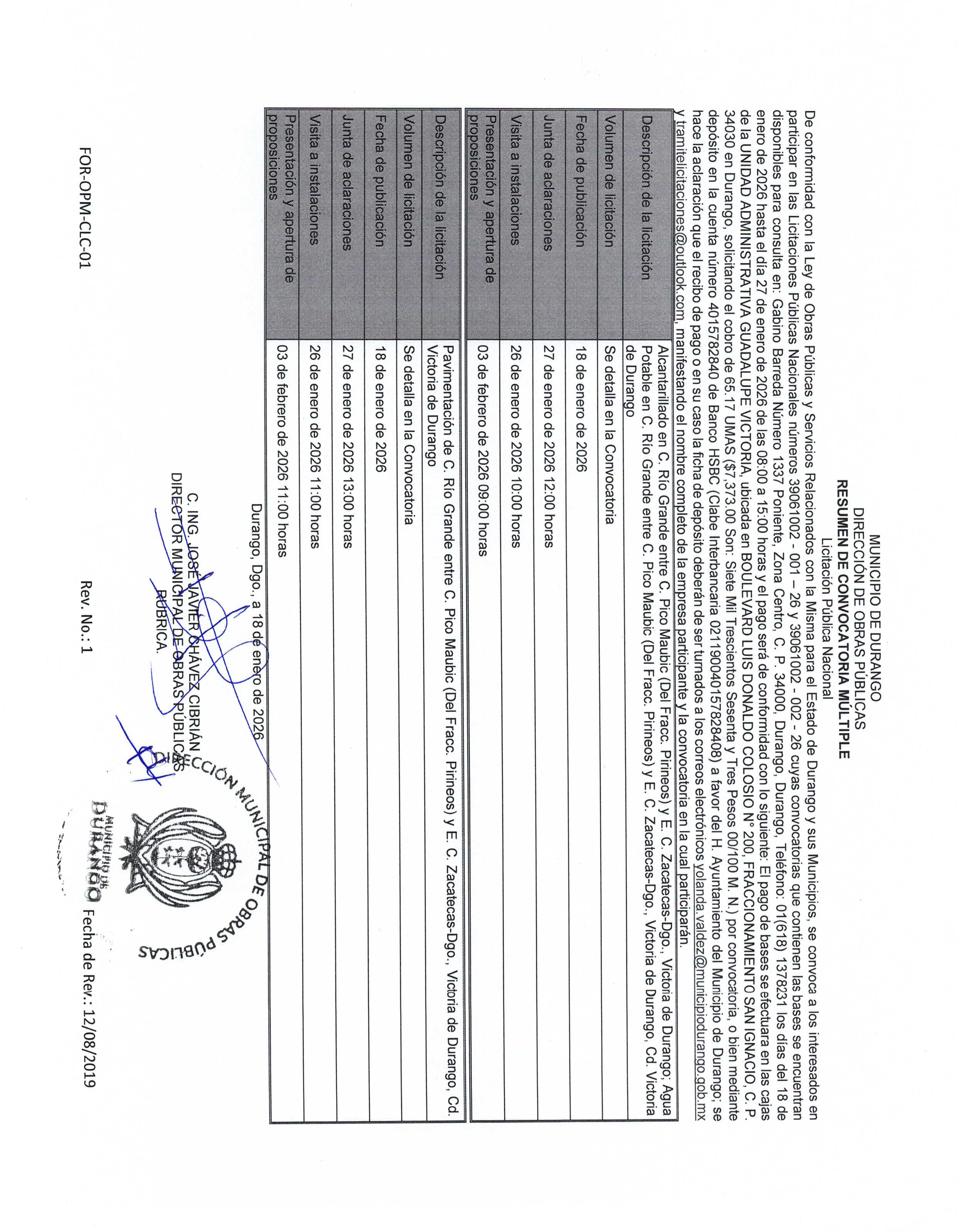 DPTO DE LICITACIONES Y CONTRATOS DE LA DIRECCIÓN MUNICIPAL DE OBRAS PÚBLICAS SITA EN CALLE GABINO BARREDA N° 1337 PONIENTE, SEGUNDO PISO, ZONA CENTRO, C. P. 34000 EN LA CIUDAD DE DURANGO, DGO.